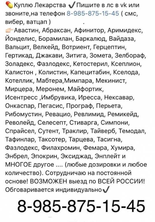 Покупаю Лекарства—8-985-875-15-45 (смс, вибер, ватцап ) .Авастин, Абраксан, Афинитор, Ацеллбия, Алимта, Аранесп, Актилизе, Аримидекс, Йонделис, Борамилан, Бонефос, Баркалюд, Вайдаза, Вальцит, Велкейд, Вектибикс, Вотриент, Гемзар, Герцептин, Гертикад, Гливек, Гемзар, Джакави, Джаклинза, Зитига, Золерикс, Земплар, Зомета, Зелбораф, Золадекс, Иресса, Исентресс, Ибранса, Имбрувика, Фазлодекс, Кадсила, Кетостерил, Ксеплион, Келикс, Колистин, Капецитабин, Кселода, Котеллик, Ксалкори, Келикс, Кивекса,Котеллик, Мабтера,Мимпара, Мекинист, Мирцера, Меронем, Майфортик, Нексавар , Октагам, Октреотид, Онкаспар, Пегасис, Програф, Перьета, Рибомустин,Ребиф, Ревацио, Ревлимид, Ремикейд, Реддитукс, Револейд, Селесепт, Стиварга, Симзия, Солирис, Симпони, Спрайсел, Сутент, Траклир, Тайверб, Темодал, Тафинлар, Таксотер, Тарцева, Тасигна, Фазлодекс, Филахромин, Фемара, Хумира, Халавен, Цивалган, Энбрел, Эпокрин, Эксиджад, Энплейт и МНОГОЕ др.☎☎☎☎